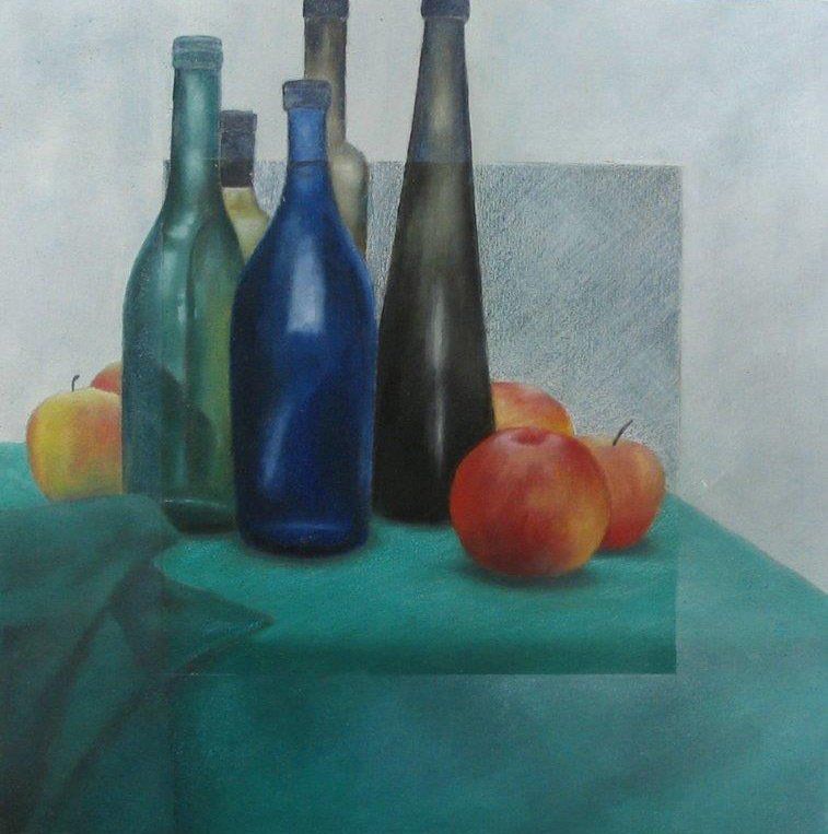“Stillleben mit Flaschen auf grün” – Öl/Eitemp./50 x 50 cm/MDF/2000