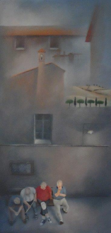 “Männer auf der Bank am Abend” – Öl/Eitemp./80 x 40 cm/2008